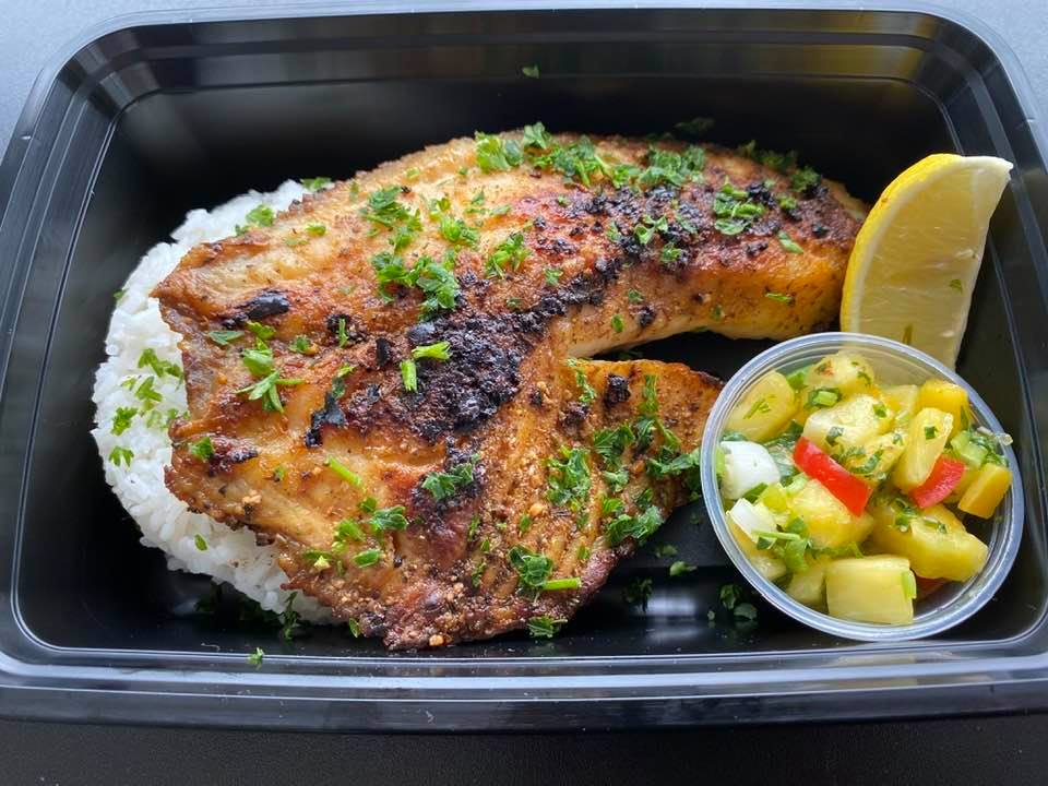 6oz Tilapia served with jasmine rice or cauliflower rice, and a side of our mango pineapple salsa.
