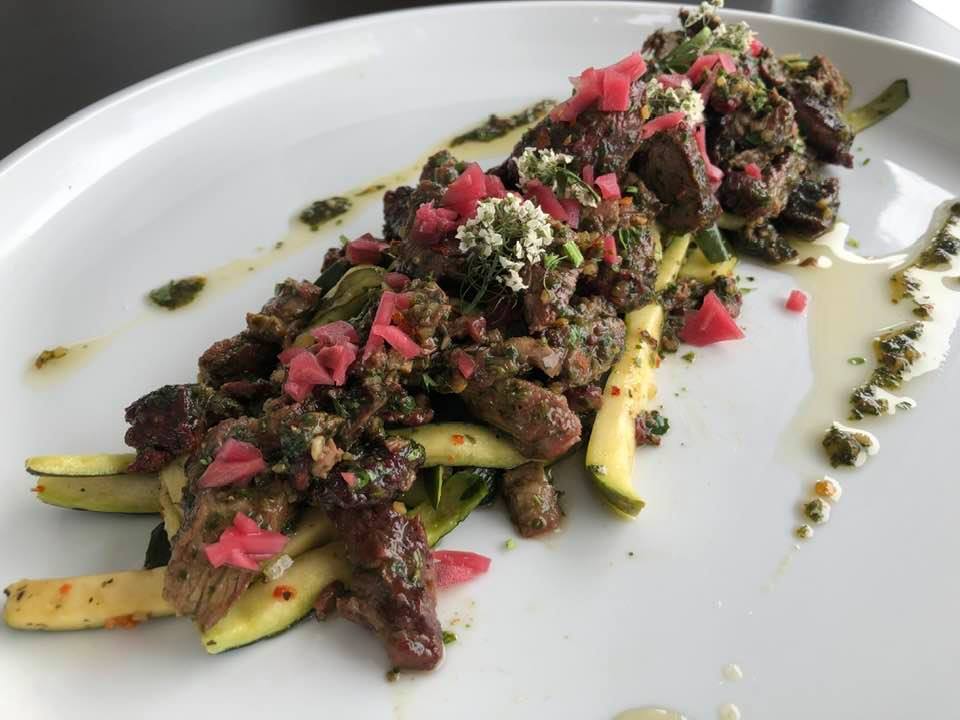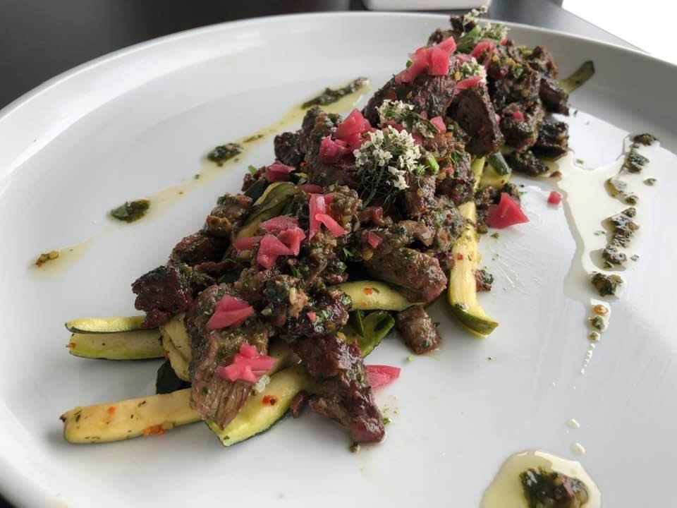 Steak with a side of our delicious chimichurri sauce served over zucchini noodles or roasted potatoes