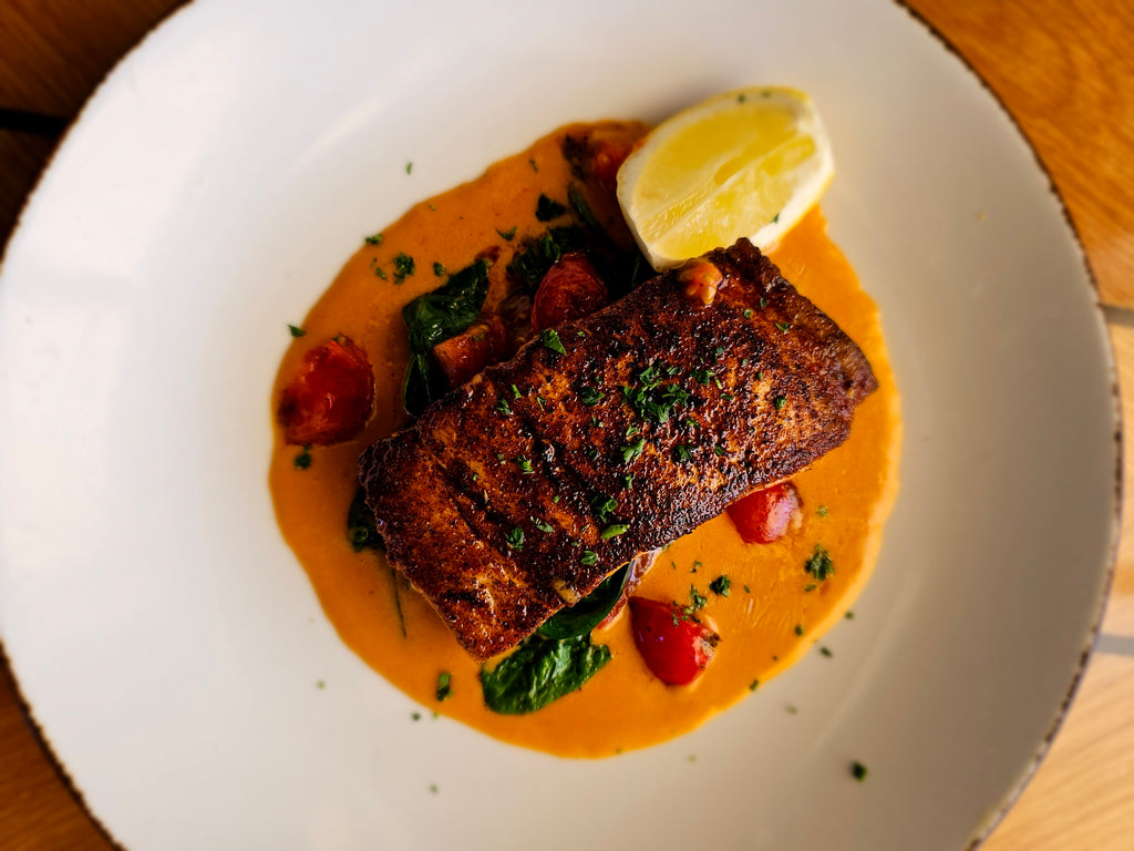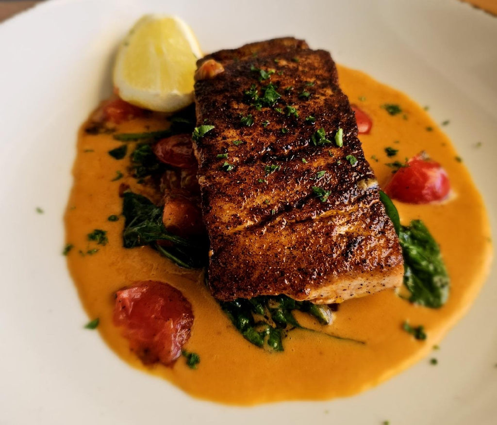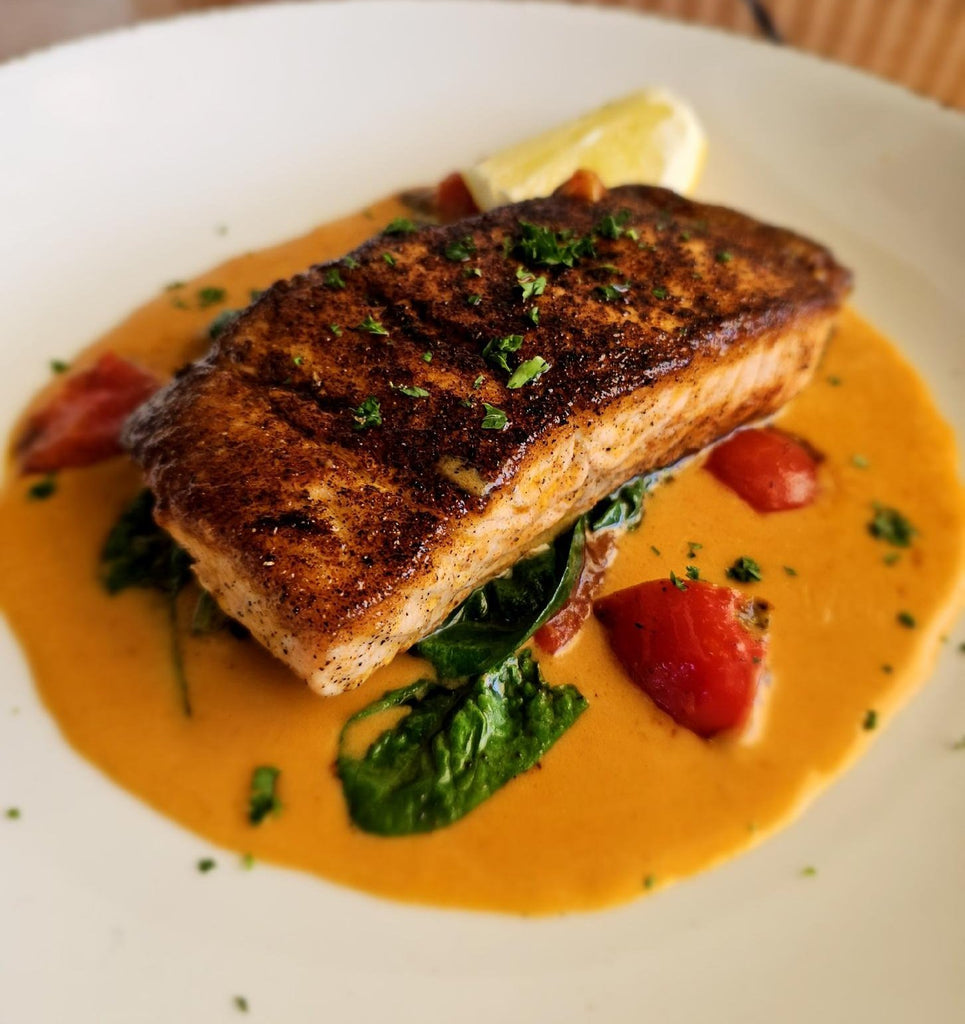 Salmon over jasmine rice or cauliflower rice with our house-made creamy creole sauce with a side of asparagus.